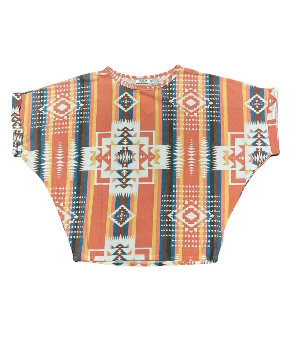 65% Polyester/ 32% Rayon/ 3% Spandex; Color: Multi-Color Aztec Print; Short Sleeves With Faux Rolled Sleeve Look; Batwing Sleeves; Style #P3-973-2P