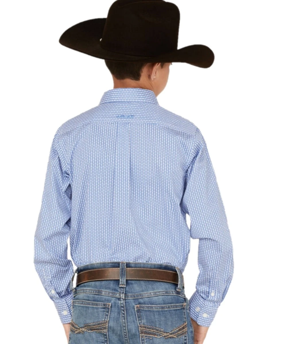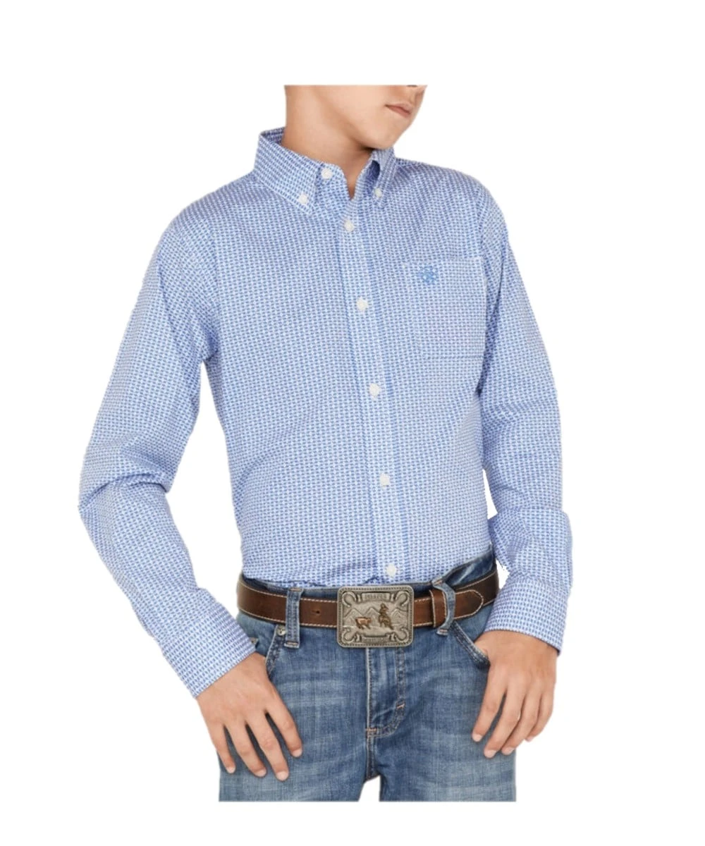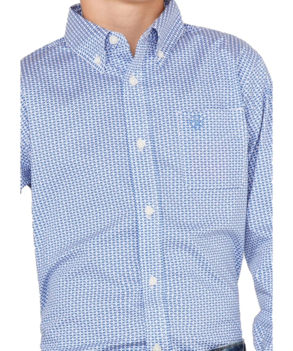 100% Cotton; Long Sleeve; Classic Fit; Button Down Collar, Placket, And Cuffs; Single Open Left Chest Pocket With Logo Embroidery; Straight Back Yoke With Logo Embroidery; Color: White And Blue Diamond Geo Print; Style #10042248