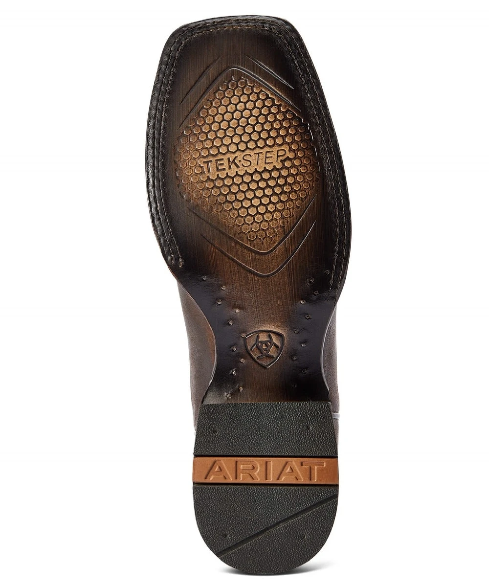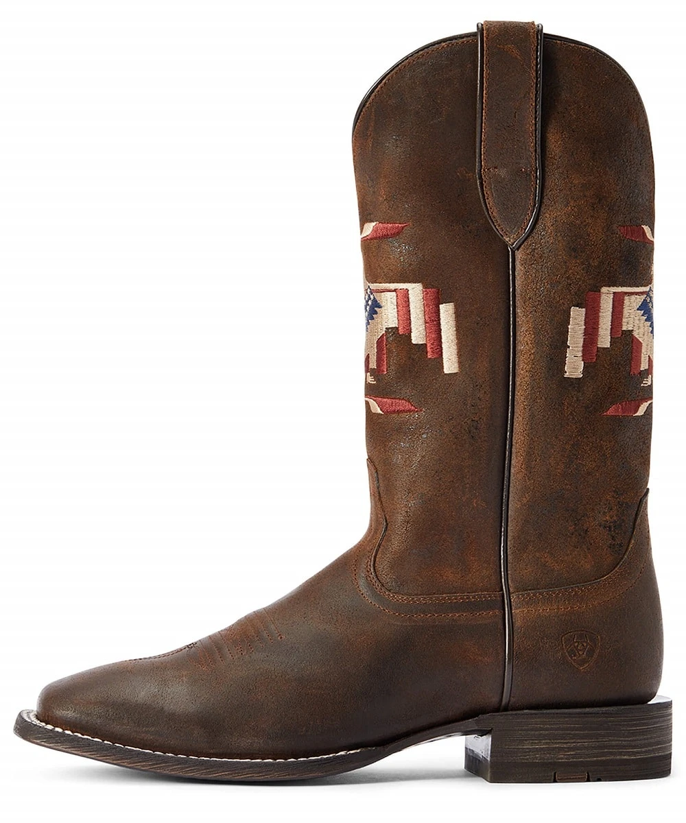 Full Grain Leather; 13″ Upper Height; Pull Tabs; Red, White And Blue Chimayo Thunderbird Embroidery On Shaft; Leather Lining; Removable All Day Cushioning Insole; TekStep Provides Toe To Heel Cushion For Comfort; 4LR Technology Provides Lightweight Support As You Walk And Ride; Wide Square Toe; 1.5″ Horseman Heel; Veg Tan Leather Outsole; Goodyear Welt Construction; Color: Saddle Up Brown; Style #10042499