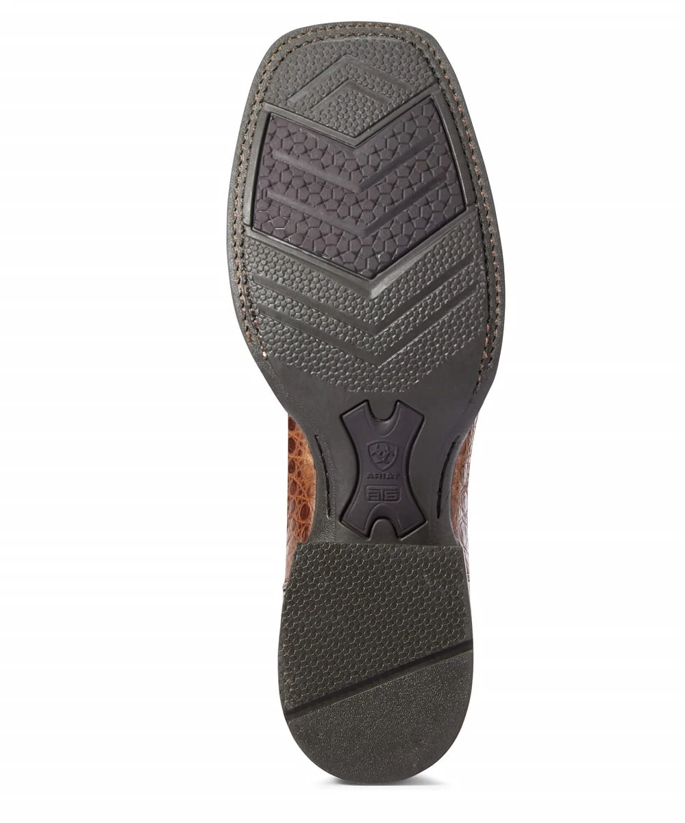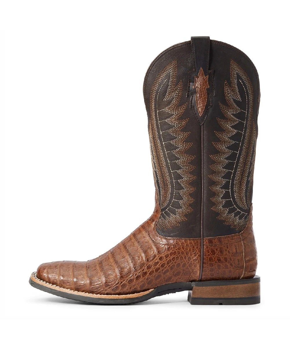 13″ Shaft; Premium Caiman Gator Belly Foot; Full Grain Leather Upper; Pull Tabs; Leather Lining; ATS Lightweight Forked Shank For Enhanced Support; Nine Row Stitch Pattern With Heavy Center Decorative Stitch; Durable Barnyard Acid-Resistant Duratread Sole; Goodyear Leather Welt Construction; Wide Square Toe; 1.5″ Horseman Heel; Color: Caramel Caiman Belly; Style #10034030