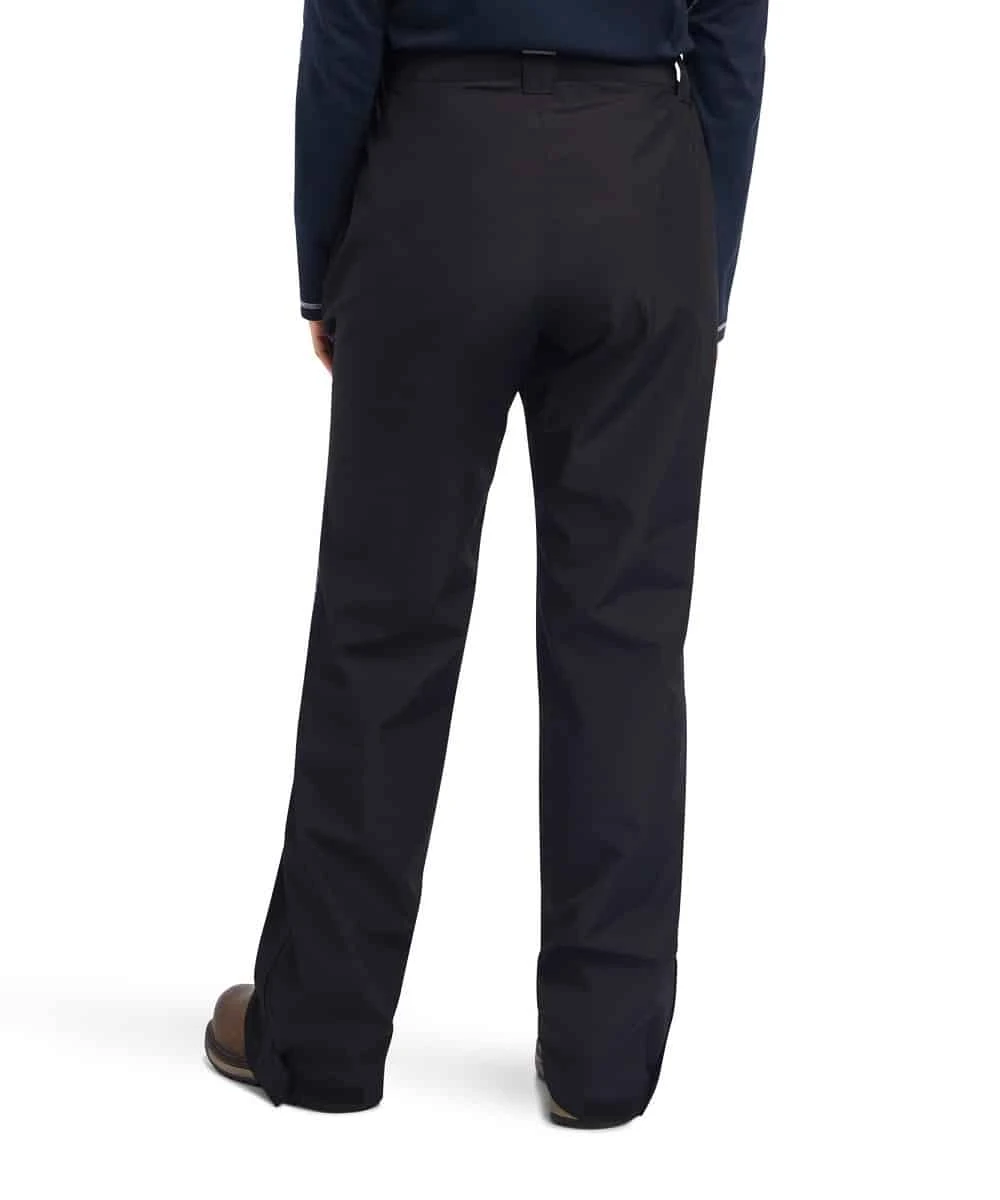 100% Polyester; 4 Oz. Shell; Elastic Waistband; Snap Closure; Hand Pockets; Breathable, Waterproof And Seam-Sealed Construction; Seam Taped; Contrast Ariat Branding Down Leg; Waterproof Storm Shell Ripstop; Zippered Leg Opening; Fit To Be Worn Over Pants/Jeans; Color: Black; Style #10041076