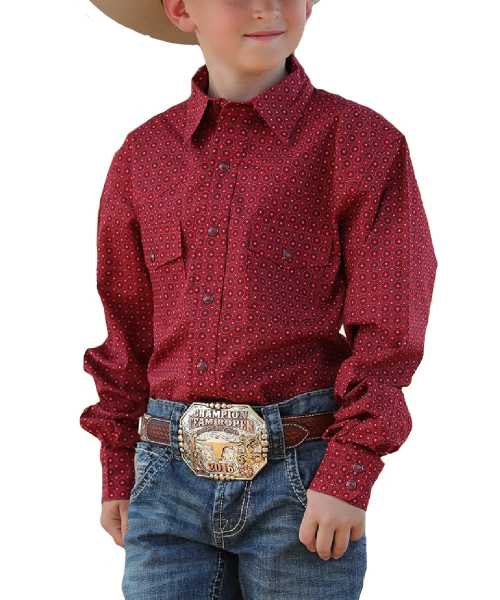 100% Cotton; Long Sleeve; Spread Collar; Snap Front And Cuffs; Two Snap Flap Chest Pockets; Single Point Front Yokes; Red Geometric Print; Color: Burgundy; Style #MTW7020093