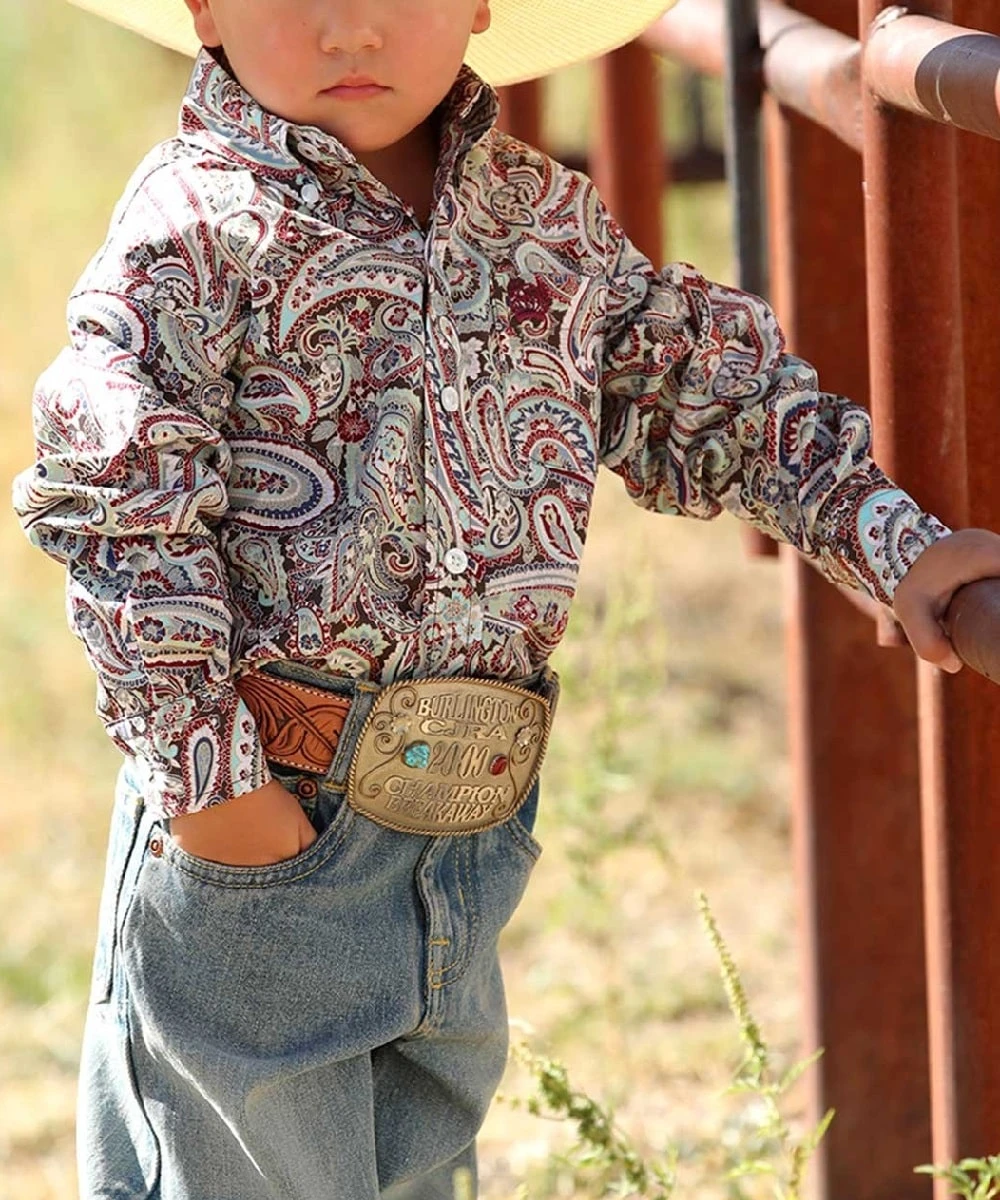 Printed Cotton Plain Weave Construction; Color: Burgundy/Aqua/Brown Paisley Print; Long Sleeve; Button Down Collar, Front And Cuffs; Open Left Front Pocket With Burgundy Embroidered Logo; White Buttons; Style #MTW7061289
