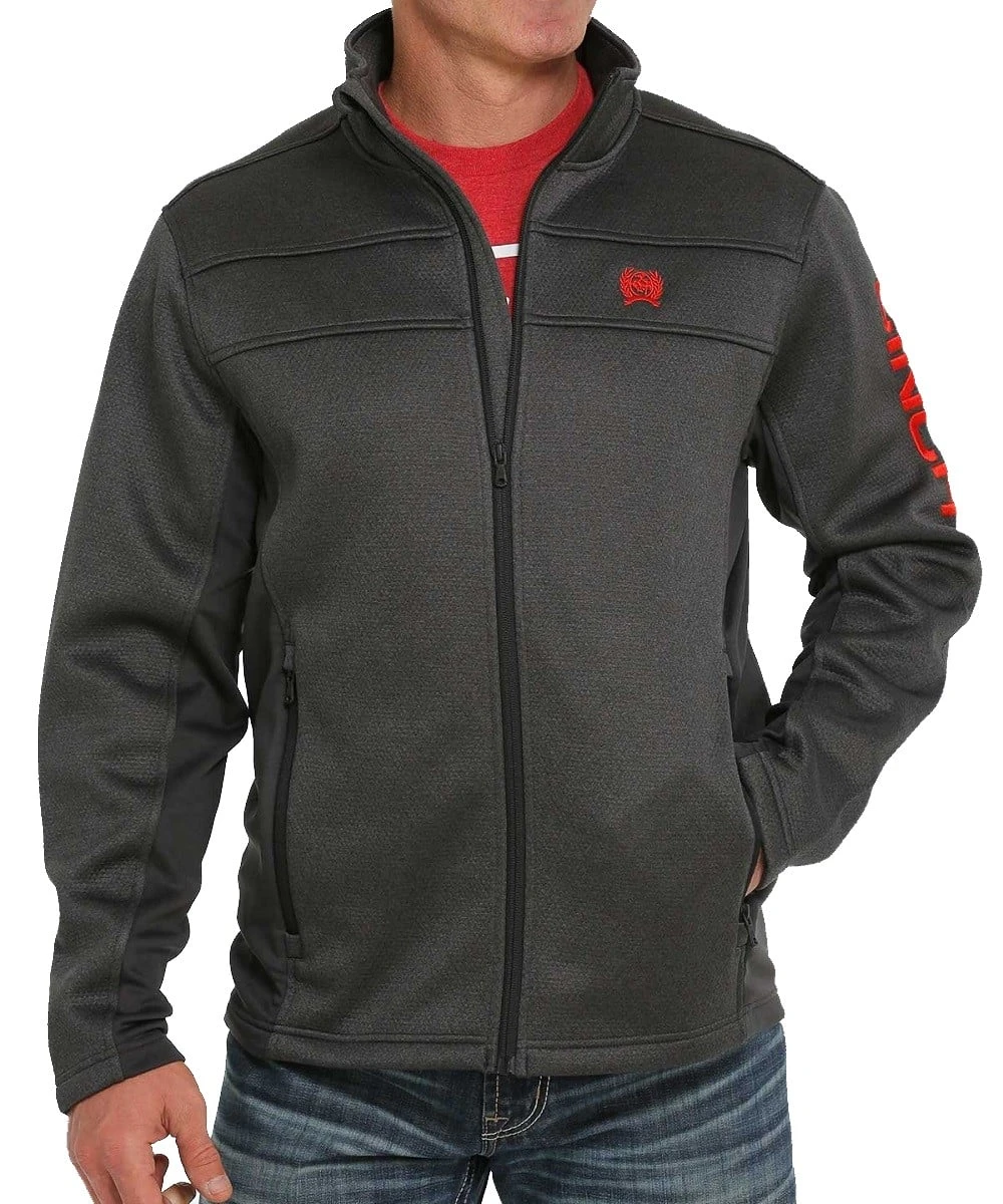 Poly-Spandex Sweater Knit Material; Lightweight Long Sleeve Jacket; Mandarin Collar; Full Zip Closure; Two Zippered Hand Pockets; Red Logo Embroidery On Chest, Sleeve, And Back; Bonded Finish; Color: Color Blocked Charcoal; Style #MWJ157001X