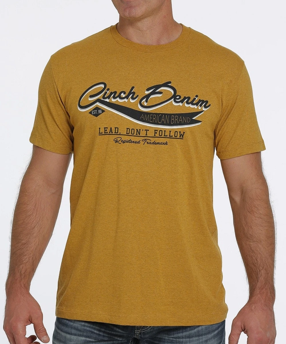Tri-Color Cotton-Polyester Blend; Short Sleeve; Crew Neckline; Blue And White Logo Graphic Print On Front; Color: Gold; Style #MTT1690512