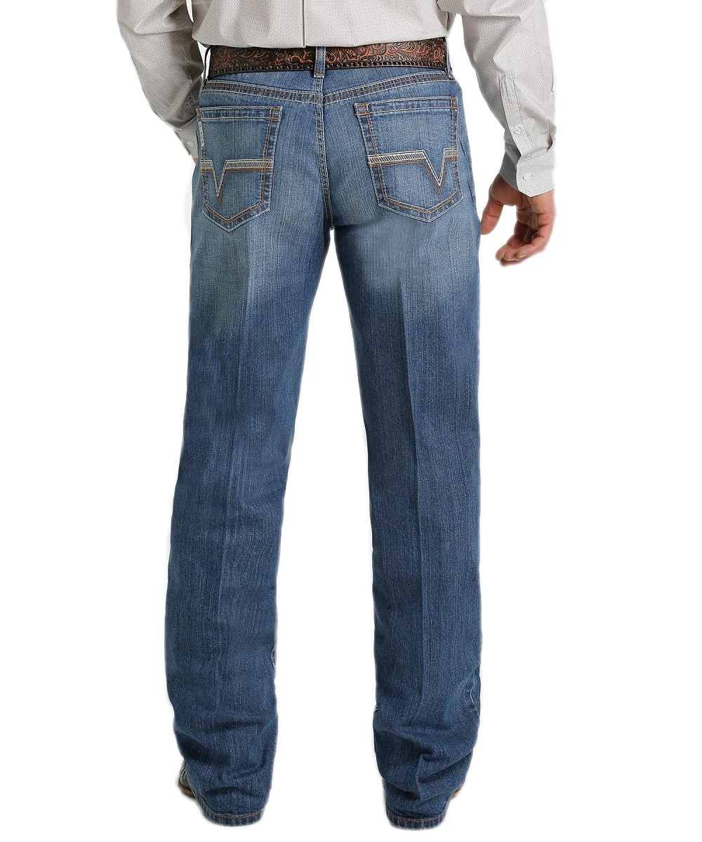 12 Oz. Performance Stretch Denim; Medium Stonewash; Mid Rise; Relaxed Fit; Whiskers; Chevrons; Tinting; Hand Sanding; Khaki Triple Needle Yoke Stitching Accent; Five Pocket Styling; Boot Cut; Style #MB53937001