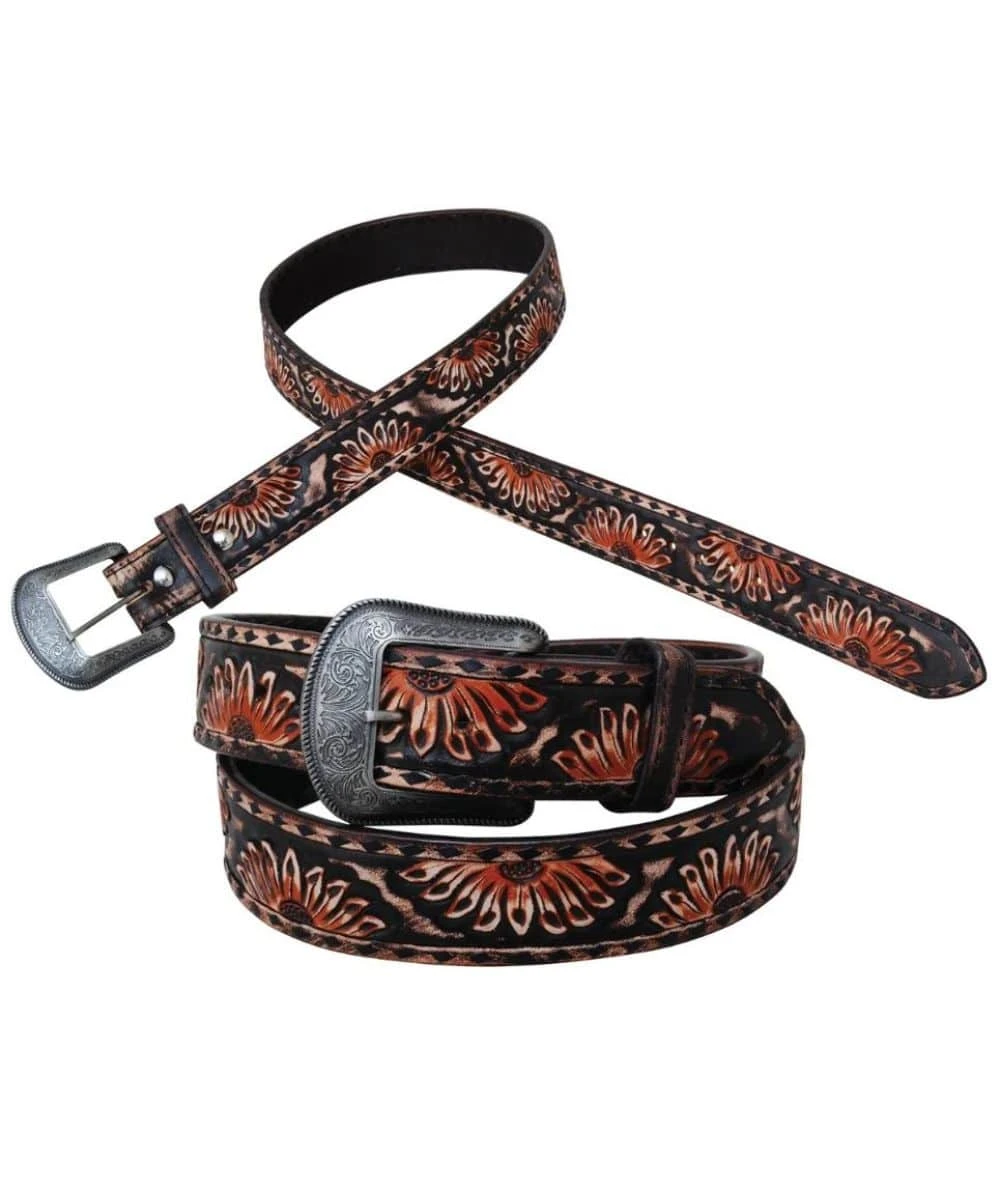 Leather; Vintage Sunflower Design; Black Buckstitching Along Edges; Distressed Finish; 1.5″ Wide; Antique Silver Etched Buckle; Removable Buckle; Style #2008-BT
