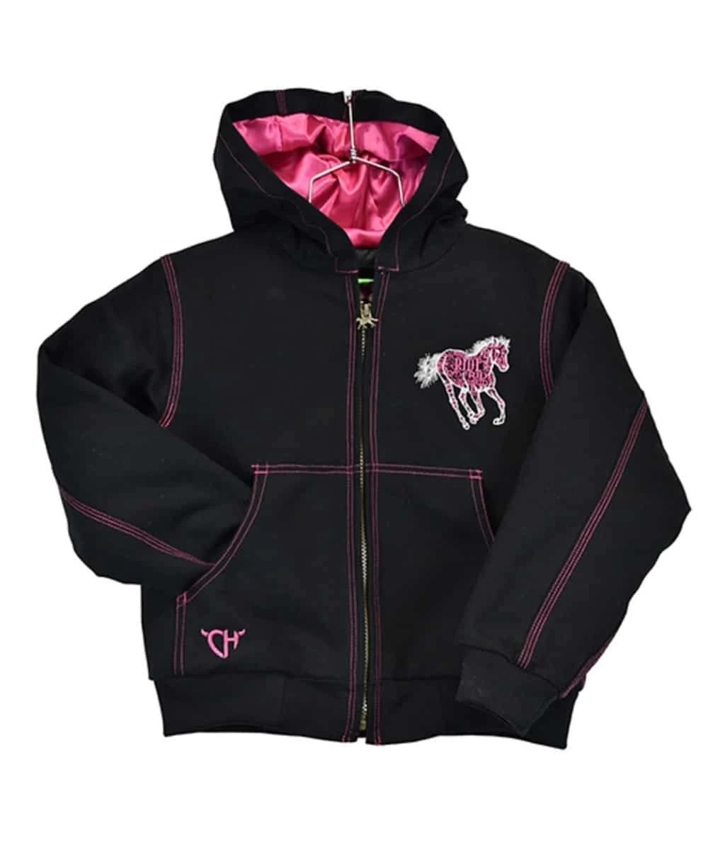 Hooded Jacket; Pink Lined Hood; Long Sleeve; Embroidered Horse Design On Back And Front; Pink Contrast Stitching On Collar, Sleeves, And Hem; Front Welt Hand Pockets; Logo Embroidery; Full Zip Closure; Horse Zipper Pull; Color: Black/Pink; Style #491257-010-K