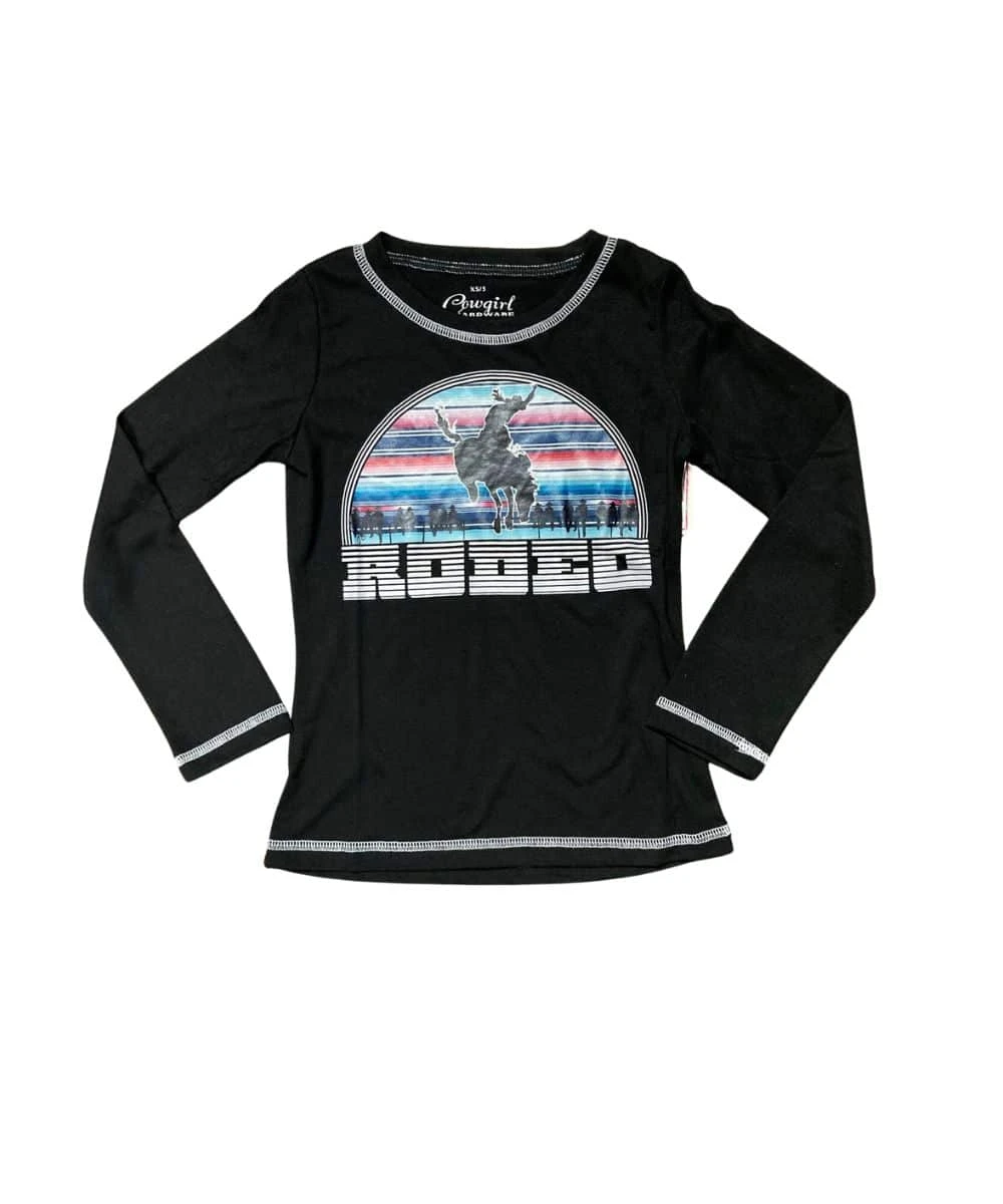 65% Polyester/ 35% Rayon; Color: Black; White Contrast Stitching; Design Is Bucking Bronco With Serape Background; Design Says “Rodeo”; Long Sleeves; Style #415476-010-K