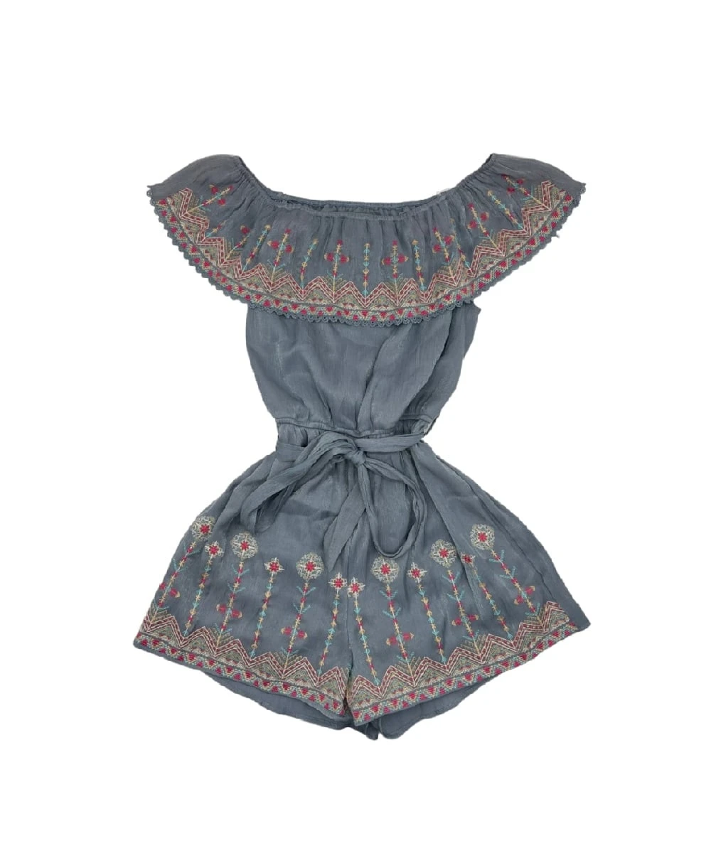 Body: 80% Rayon/20% Nylon; Shorts Lining: 100% Polyester; Off The Shoulder Sleeves; Embroidered Neck Accent With Lace Trim; Waist Accent Tie; Bottom Embroidered Accent; Color Shimmery Blue; Style #53362