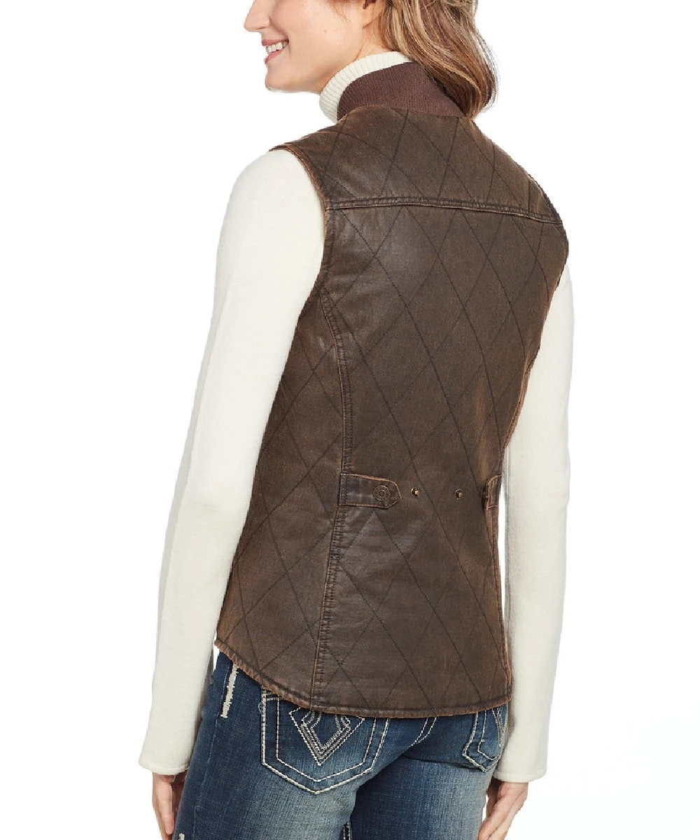 65% Cotton/35% Polyester; Enzyme Washed Distress Finish; Knit Collar; Snap And Zip Front Closure; Cripple Creek Logo Snaps; Quilted Top Stitch Detail; Hand Pockets With Snap Closures; Straight Back Detail; Adjustable Snap Waist Tabs On Back; Color: Antique Brown; Style #CW8319