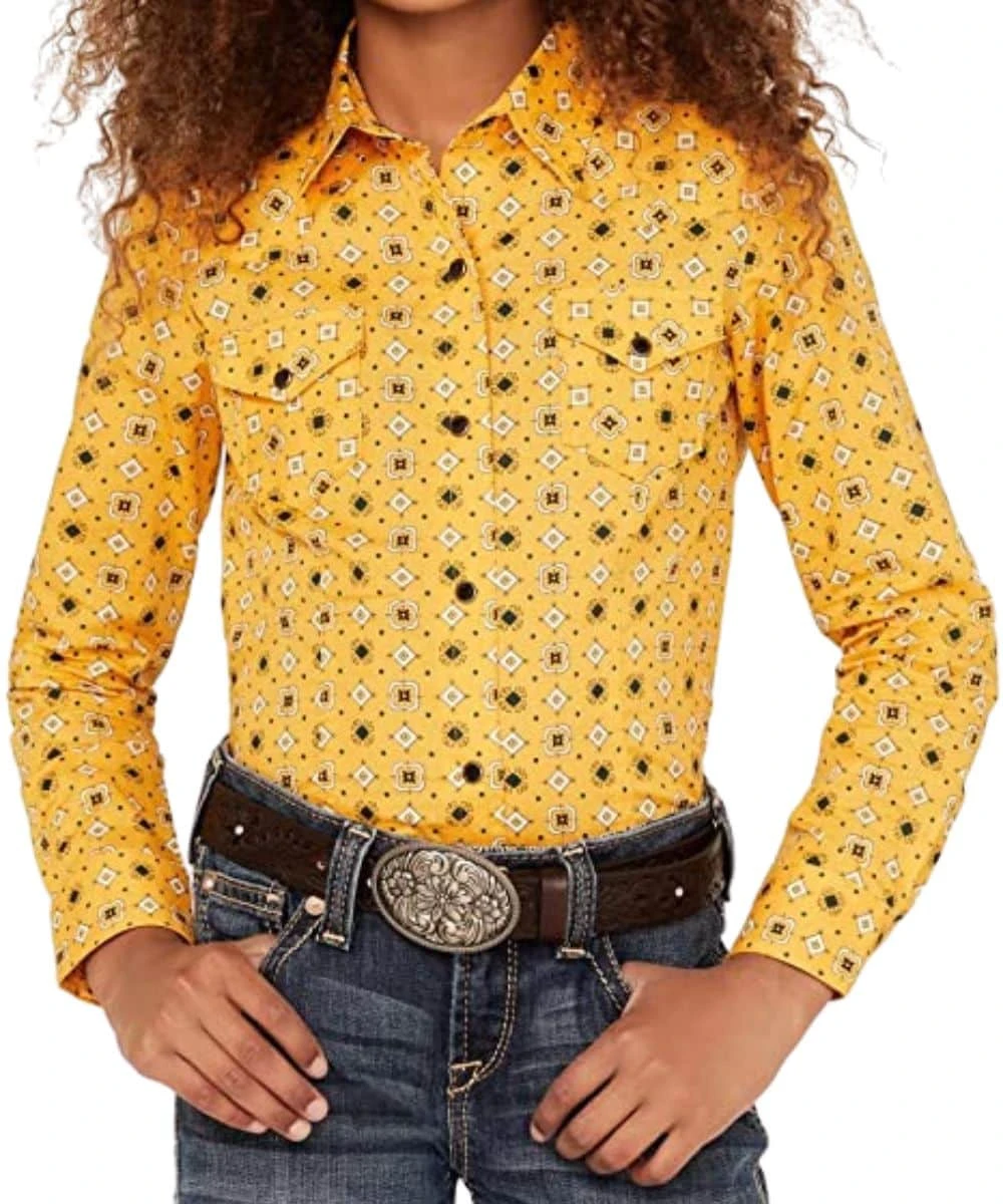Printed Cotton Plain Weave; Long Sleeve; Spread Collar; Front Snap Closure And Cuffs; Black Rhinestone Snaps; Dual Single Point Snap Flap Chest Pockets; Two Single Point Front Yokes; Single Point Back Yoke; Color: Gold Geo Print; Style #CTW3230037