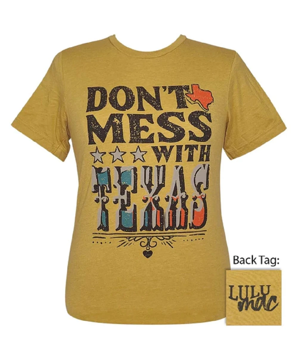 52% Cotton/ 48% Polyester; “Don’t Mess With Texas” Design; Mustard Yellow Tee; Classic Fit; Pre-Shrunk; Style #210000015715