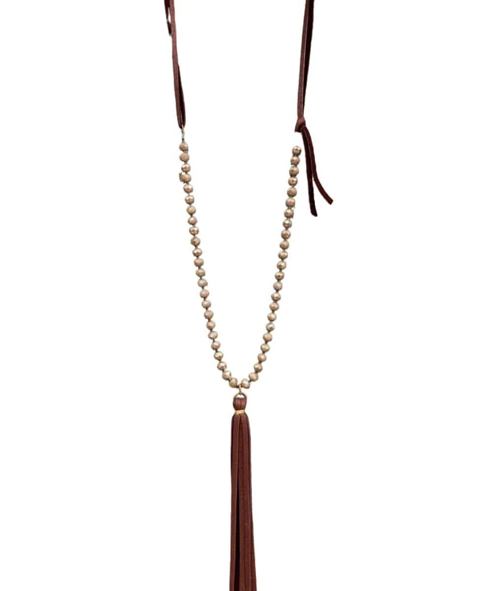 28″ Necklace; Mauve Austrian Crystal Beads; Leather Necklace Strap; Leather Tassel; Style #16506