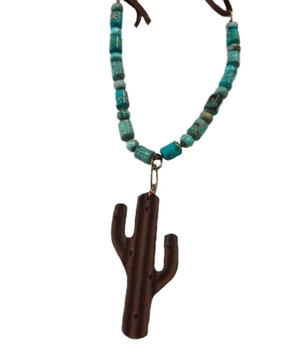 28″ Length; Imperial Jasper Beads; Hand Tooled Chocalate Leather Saguaro Pendant; Chocolate Leather Back; Style #16174