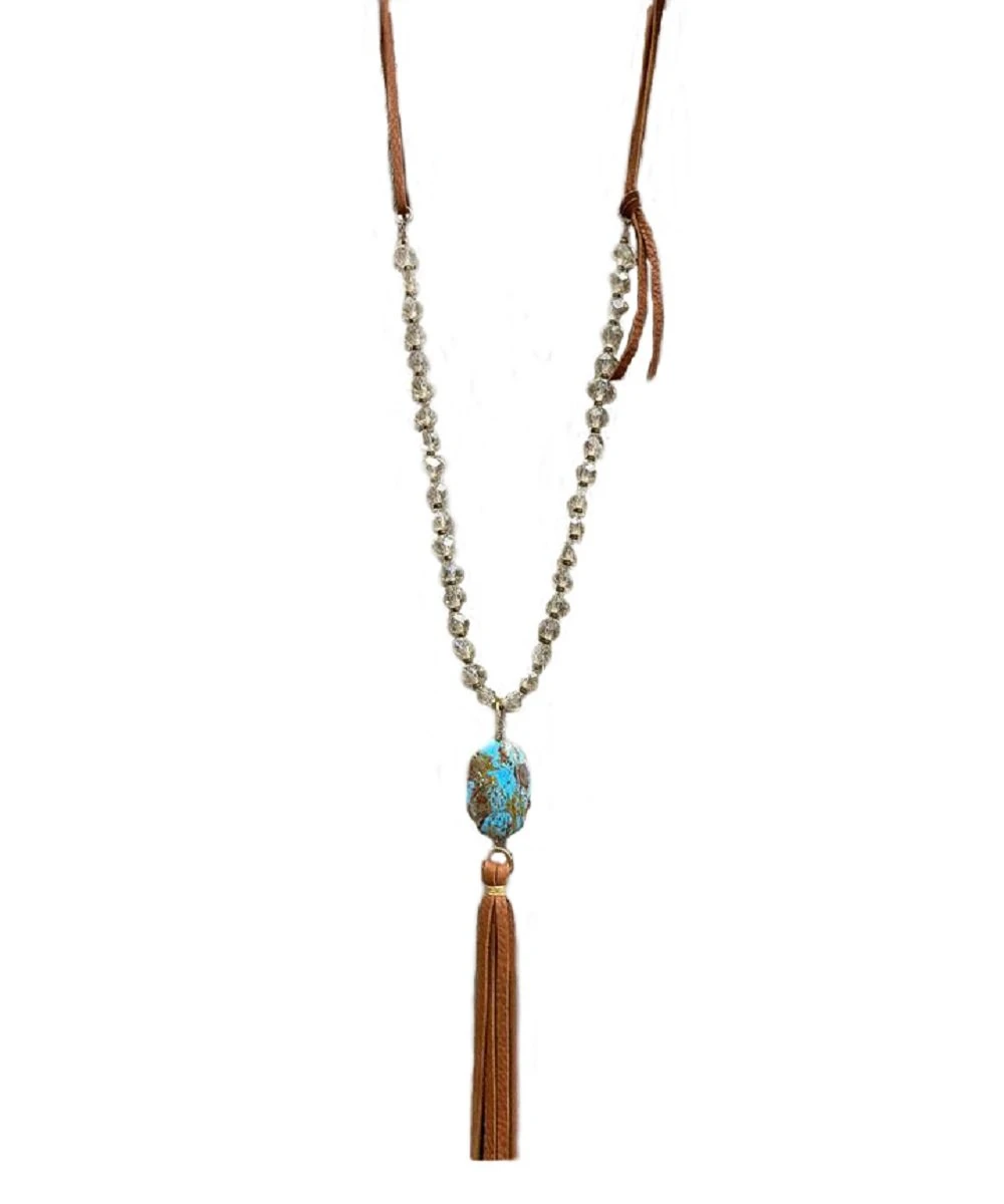 30″; Light Golden Austrian Crystal; Gem Silica Drop; Saddle Tan Leather Tassel; Style #17006