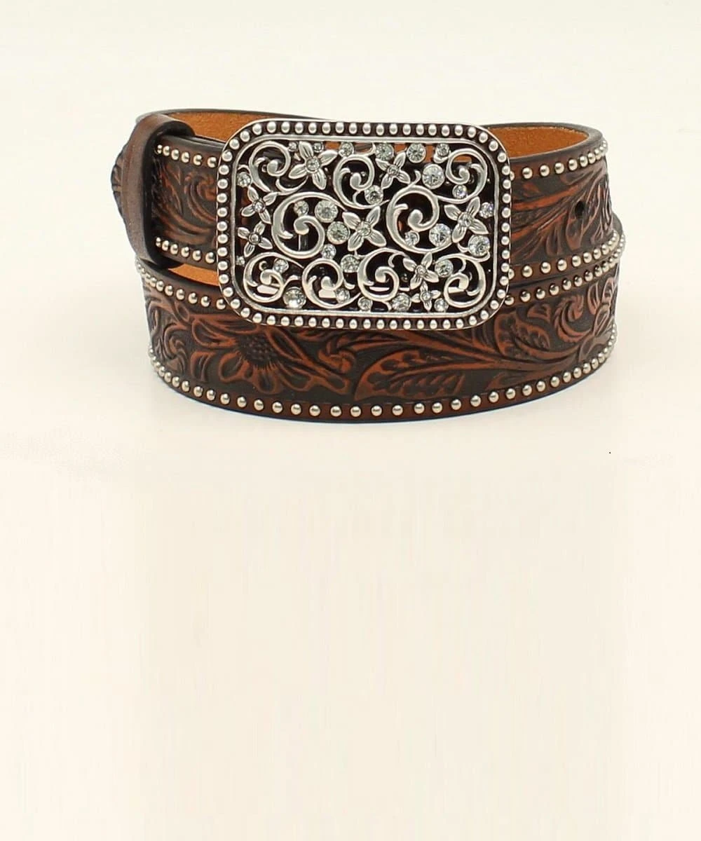Floral Embossing; Embellished Edges With Silver Studs; Rectangle Beaded Edge Floral Pattern Buckle With Rhinestones; Style #A1303602