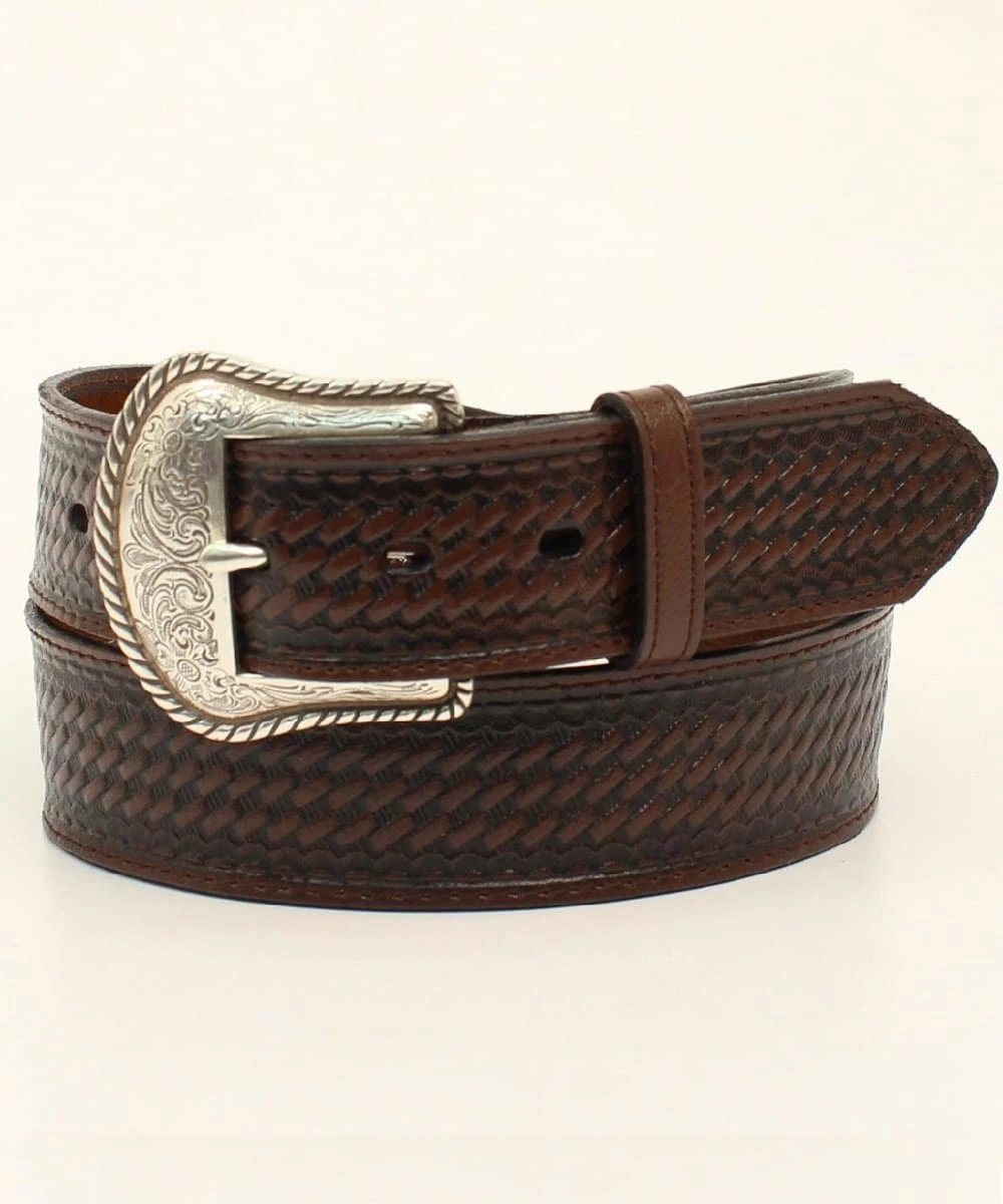 1 1/2″ Wide; Embossed Basket Weave Pattern; Single Keeper; Removable Silver Etched Buckle; Style #N1010602