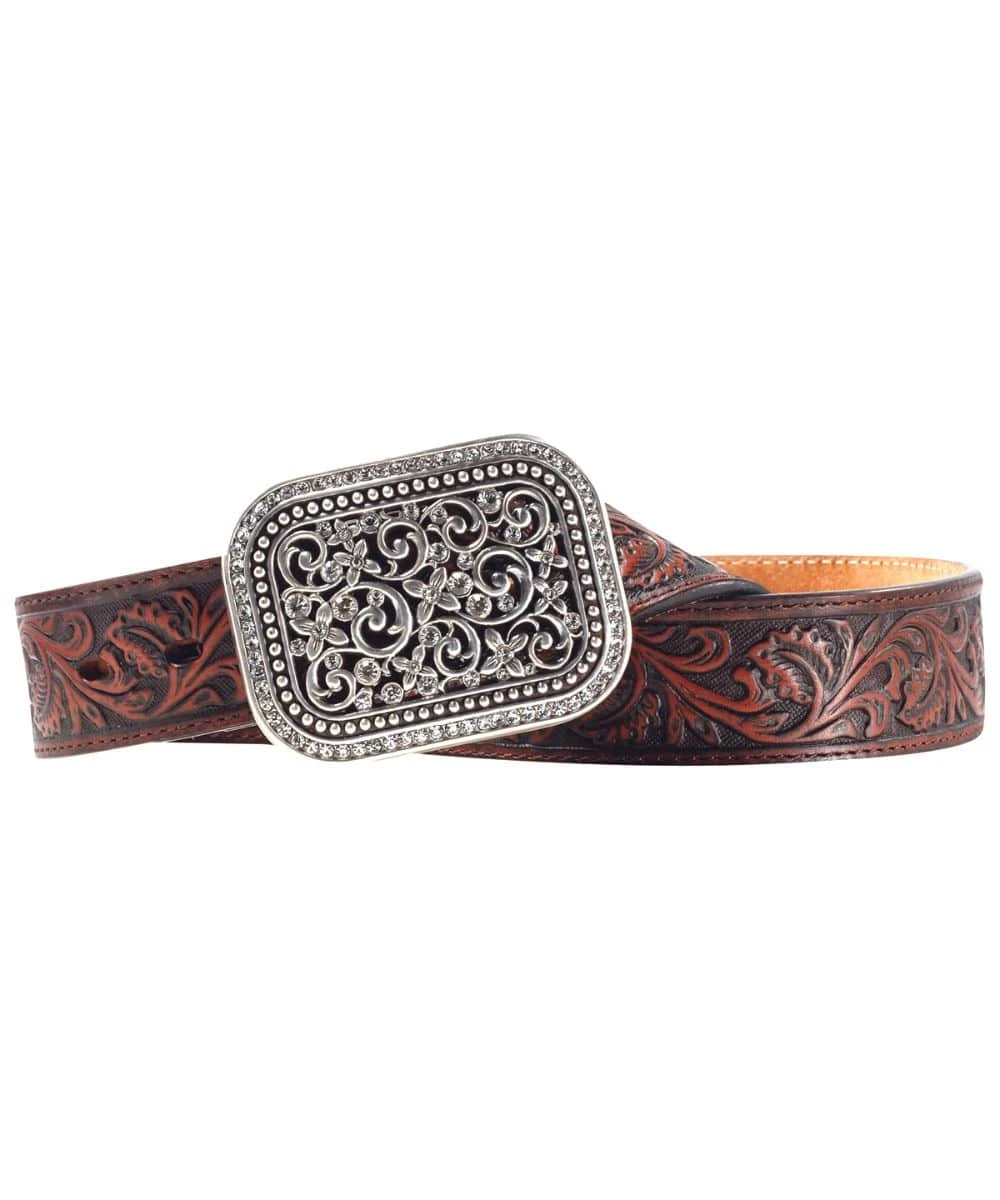 Leather; Embossed Design; 1-1/2″ Wide Strap; Rectangle Buckle With Ornate Design; Silver Buckle With Rhinestones Throughout And Along The Edges; Style #A10006957