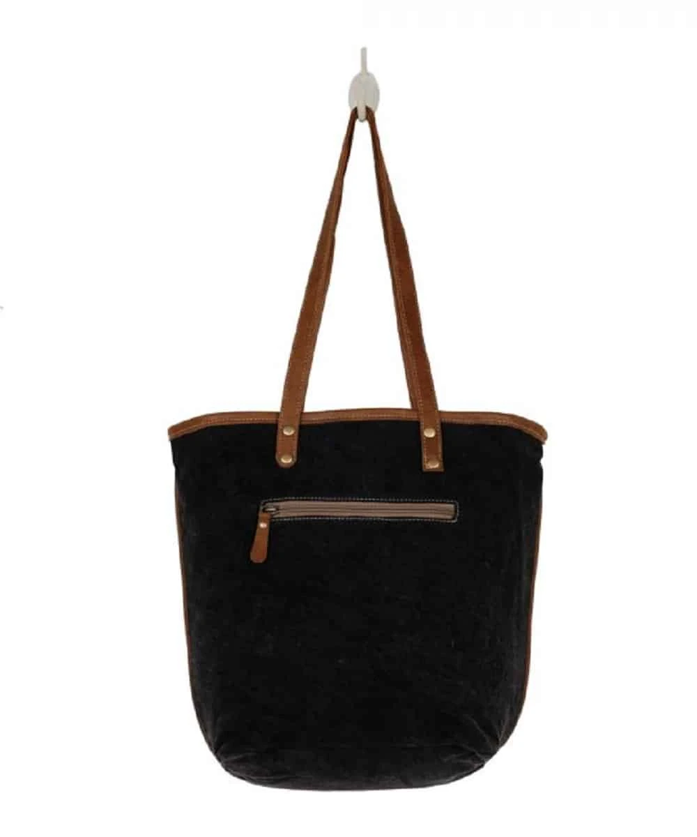 Canvas, Rug, Leather, And Hairon Material; Gray And White Floral Pattern On Front; Hairon Strap On Bottom Front; Back Zippered Pocket; 12″ Handle; Measures Approximately: 16″W x 6.5″D x 13″H; Style #S-2542