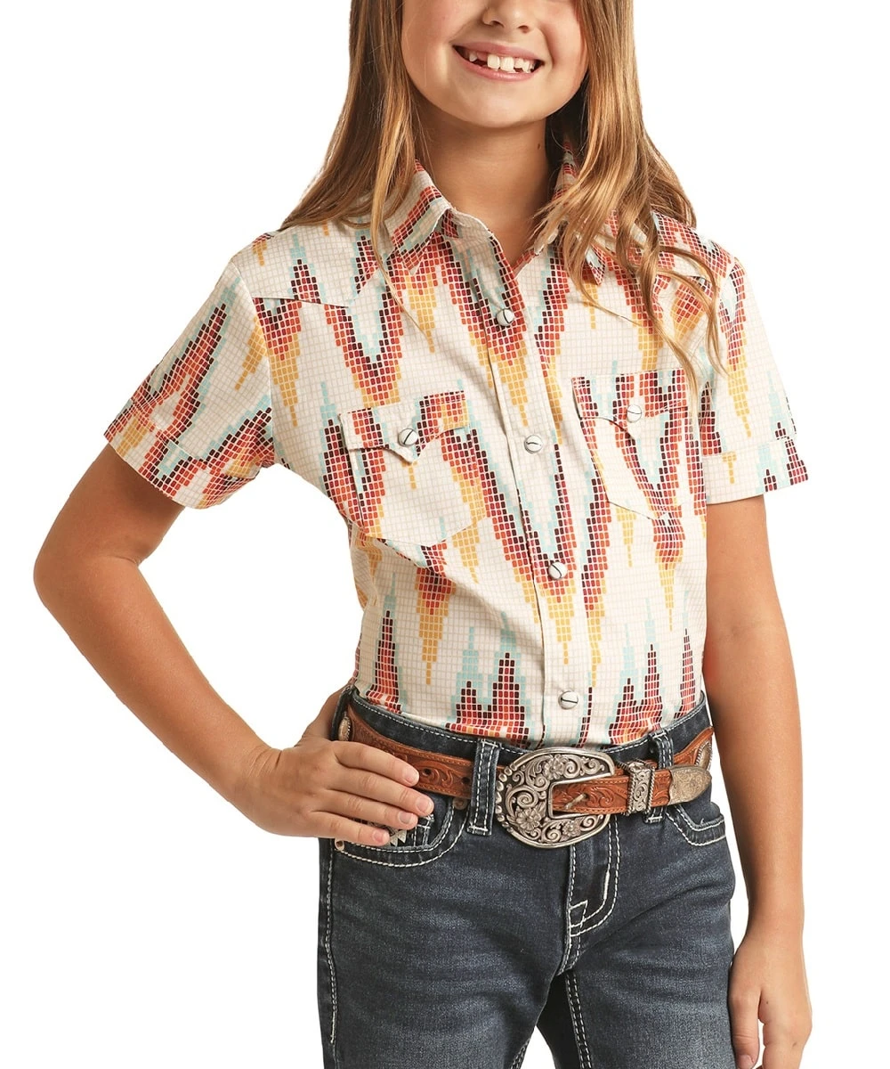 100% Cotton; Short Sleeve; Spread Collar; White Snap Closures; Snap Front; Two Snap Flap Chest Pockets; Single Point Front Yokes; Red, Orange And Light Blue Geometric Print; Color: Cream/Natural; Style #RRGS1SRZ7U
