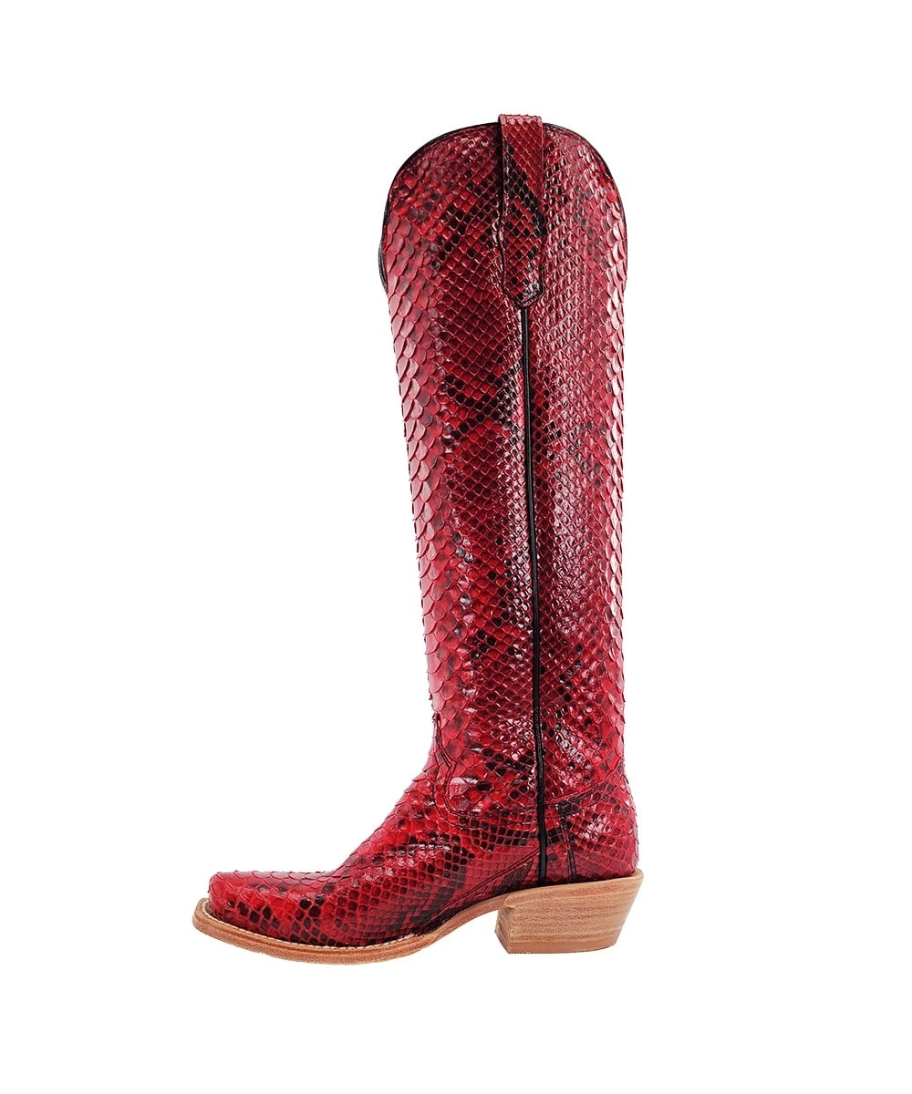 17″ Boot; Red And Black Python; R. Watson Comfort System; Solid Steel Shank; All Leather Stacked Cowboy Heel; Cutter Toe; Counters; 10 Iron Outsole; Style #RWL7213-1
