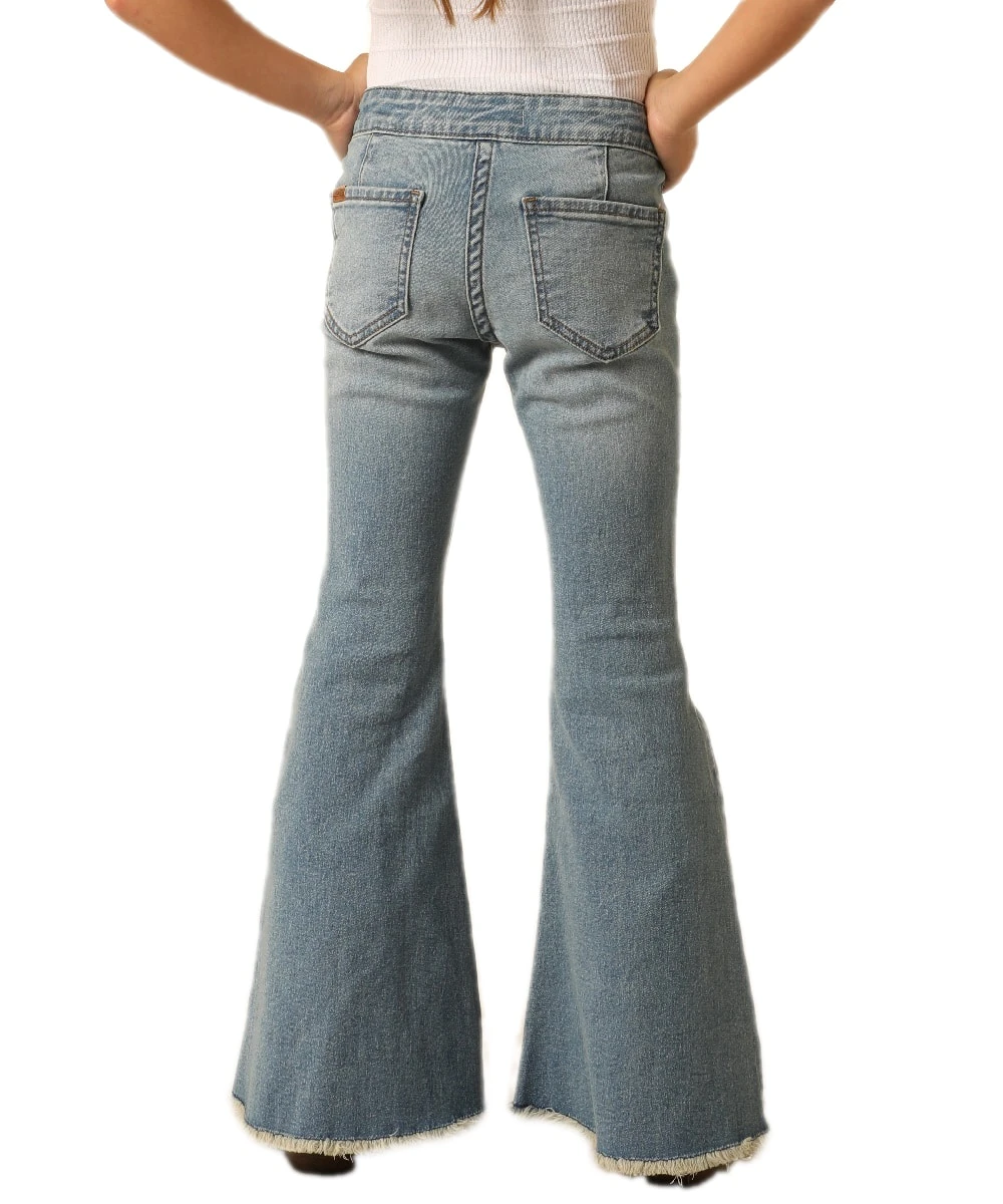 92.5% Cotton/6% Polyester/1.5% Spandex; Light Wash; Plain Back Pockets; Raw Edge Bell Bottom; Style #RRGD7PRZSZ