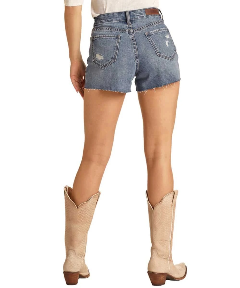 100% Cotton; Non-Stretch; Mid Rise; Zip Fly With Button Closure; Five Pocket Styling; Distressed Front And Back; Raw Hem; Medium Wash; Style #RRWD68R0VB