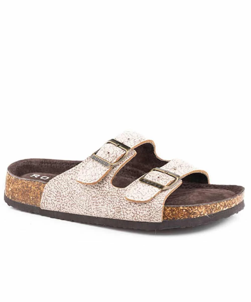 Off White Suede; Molded Cork Midsole; 2 Adjustable Strap Footbed; Black Blown Rubber Outsole; Soft Brown Comfort Sock Liner; Style #09-021-0607-3145