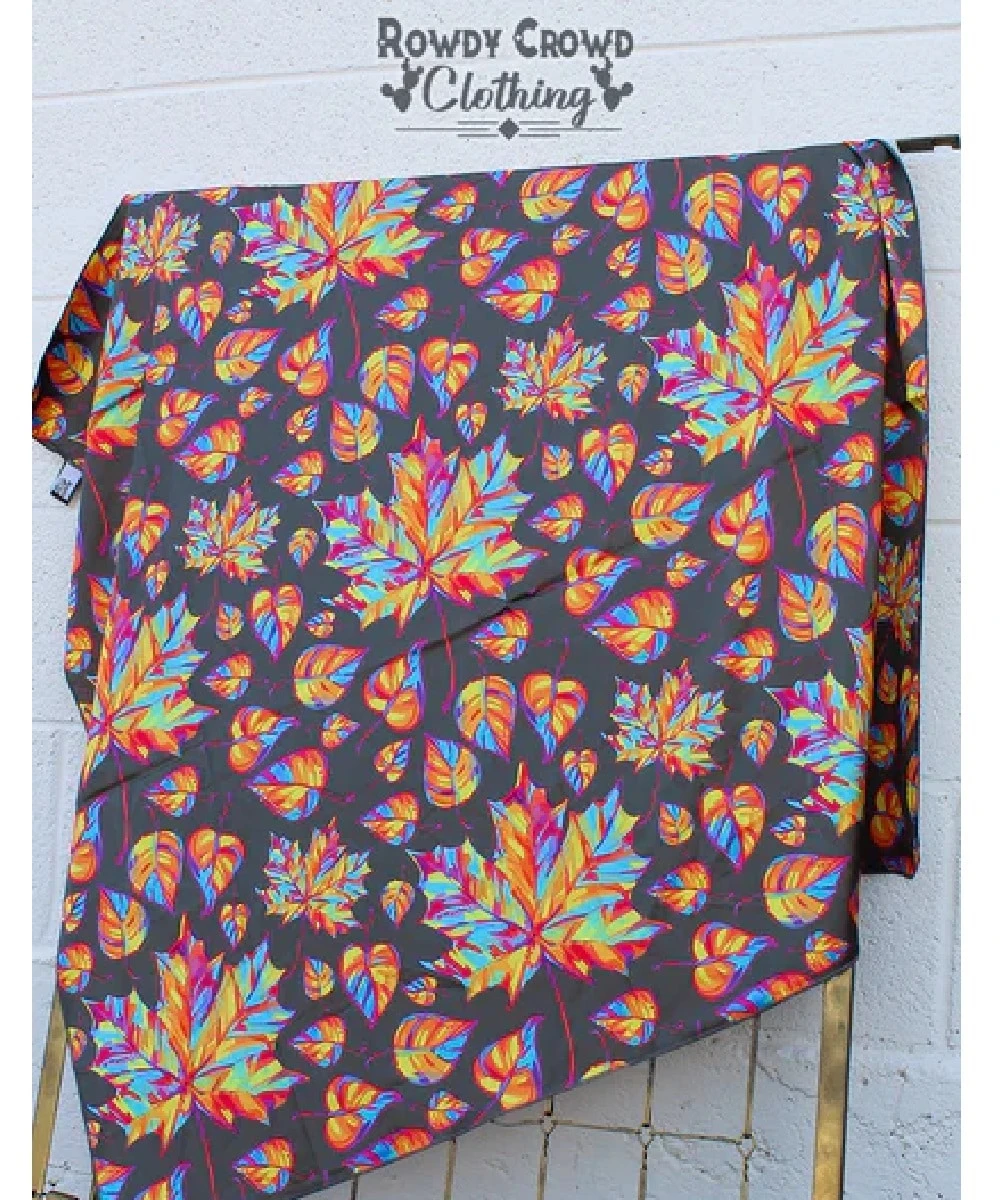 100% Polyester; Grey With Multi Color Leaves Print; Measures Approximately 36″ x 36″; Style #FALLING FOR YOU WILDRAG
