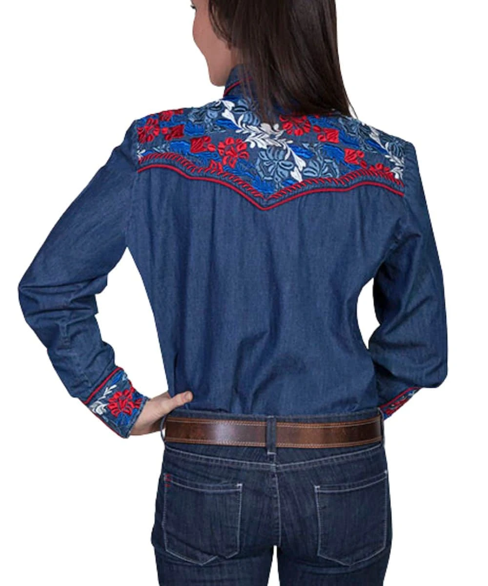 Poly-Rayon Blend; Color: Medium Denim; Multi-Color Floral Embroidery On Front And Back Yokes And Cuffs Of Sleeves; Red Piping; Spread Collar; Snap Front Closure; Smile Pockets; Style #PL-654C