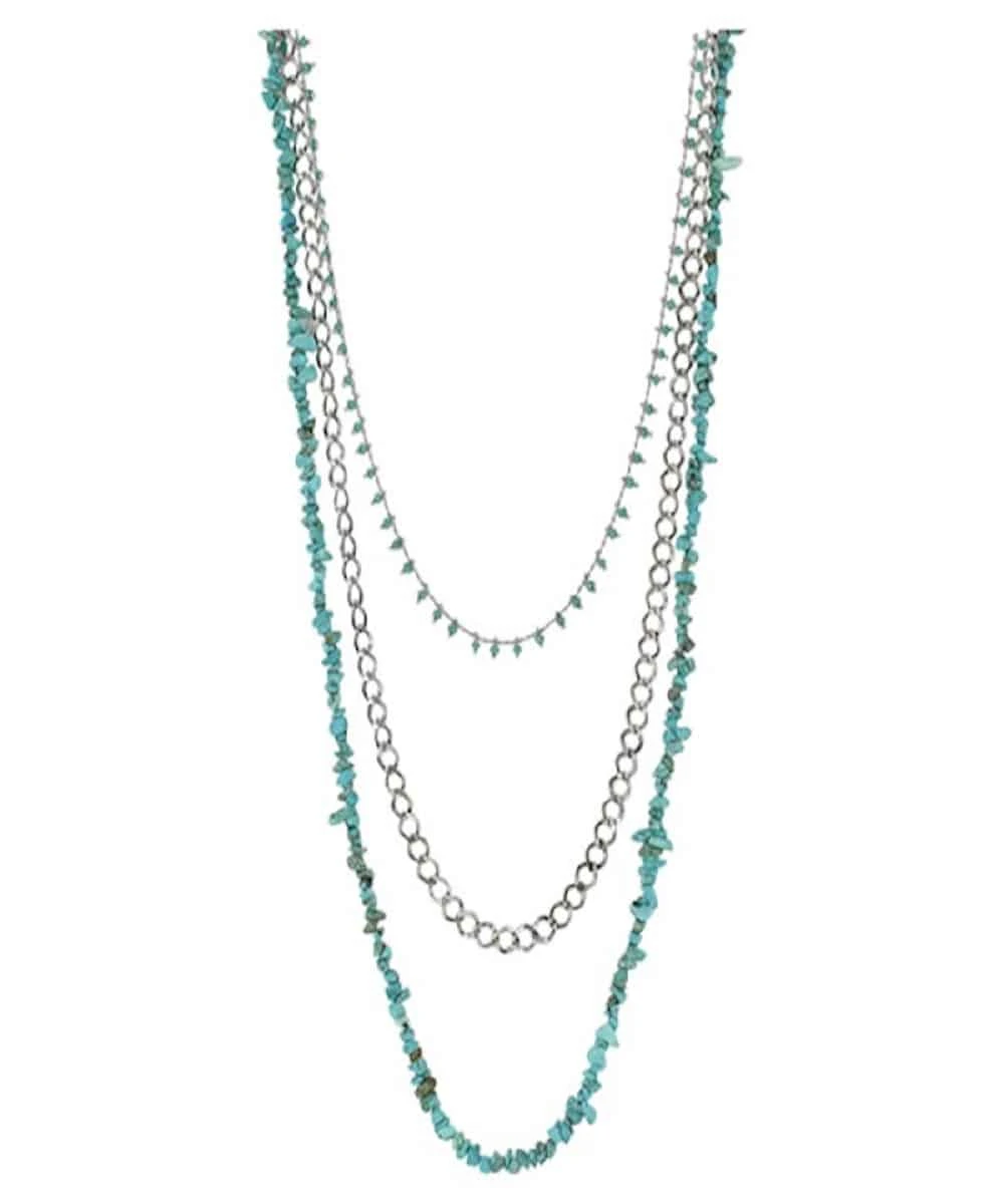 Silver Finished Zinc Alloy; 3-In-1 Necklace; Turquoise Colored Stone Nuggets; Turquoise Colored Beads; Chains Measure: 20″, 26″, And 30″; Style #22178NJ1
