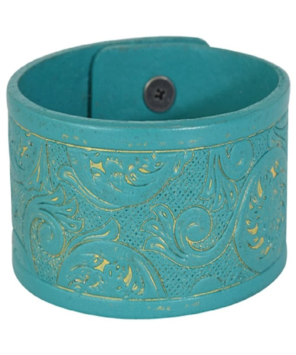 Genuine Leather; Justin Bracelet; Turquoise Color With Tooled Pattern; Snap Closure; 2.5″W; Style #22071BJ2