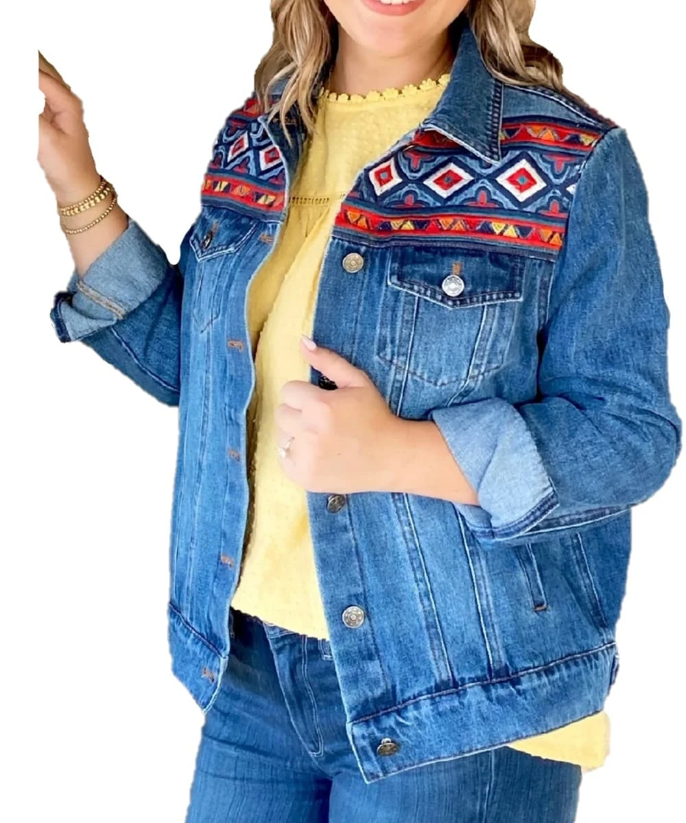 100% Denim; Spread Collar; Long Sleeve; Pewter Snaps; Two Chest Pockets; Two Hand Pockets; Cuffs; Multi Color Embroidery Design On Front And Back; Style #JODIE