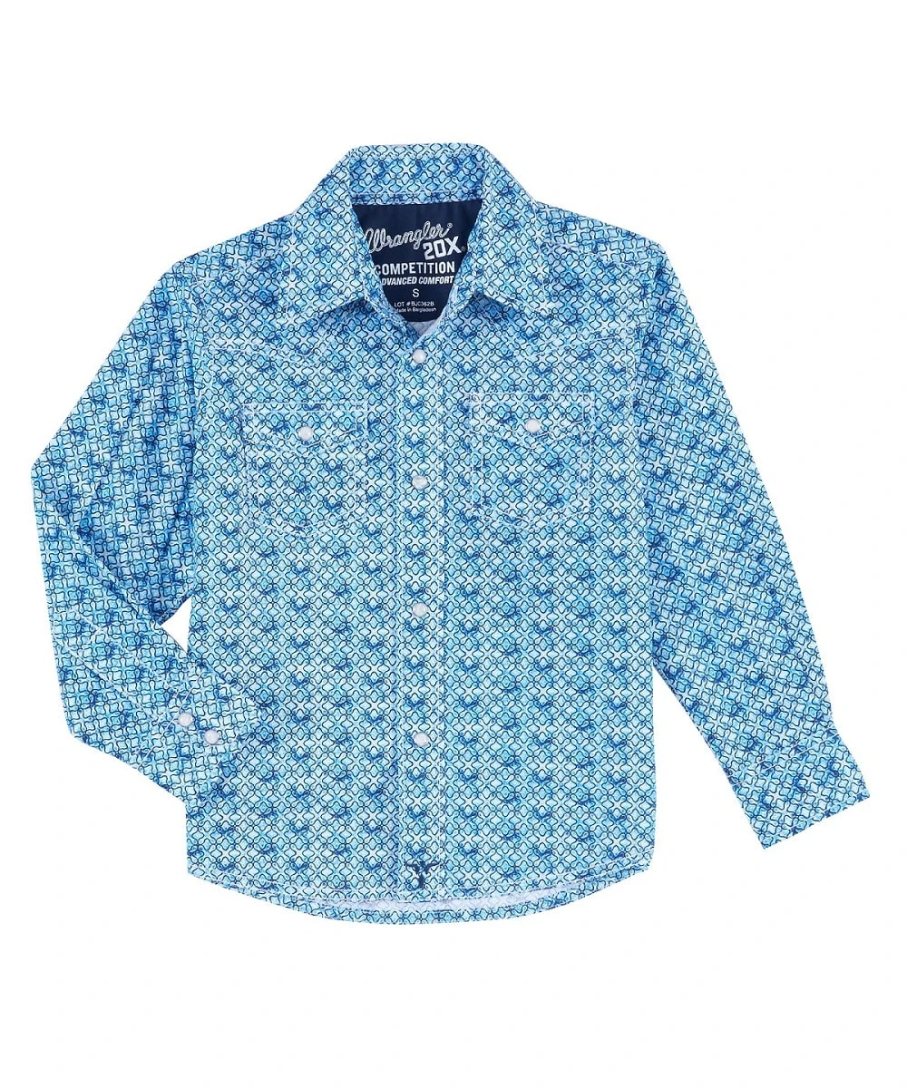 97% Cotton/3% Elastane; Long Sleeve; Spread Collar; Snap Front Placket, Pockets, And Cuffs; Two Snap Flap Chest Pockets; Single Point Front Yokes; Single Point Back Yoke; Color: Blue Geo Print; Style #112314923