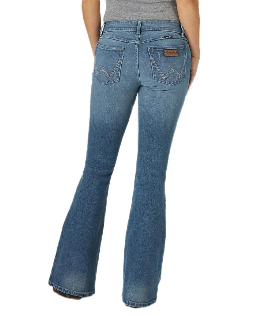 99% Cotton/1% Spandex, 11.5 Oz. Stretch Denim; Mid Rise; Regular Fit; Five Pocket Styling; Whiskers; Fading; Sanding; Stitched Wrangler ‘W’ Back Pockets; Flare Leg; Style #09MWFQG